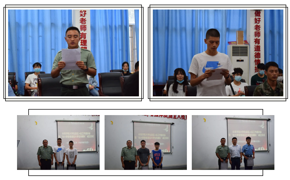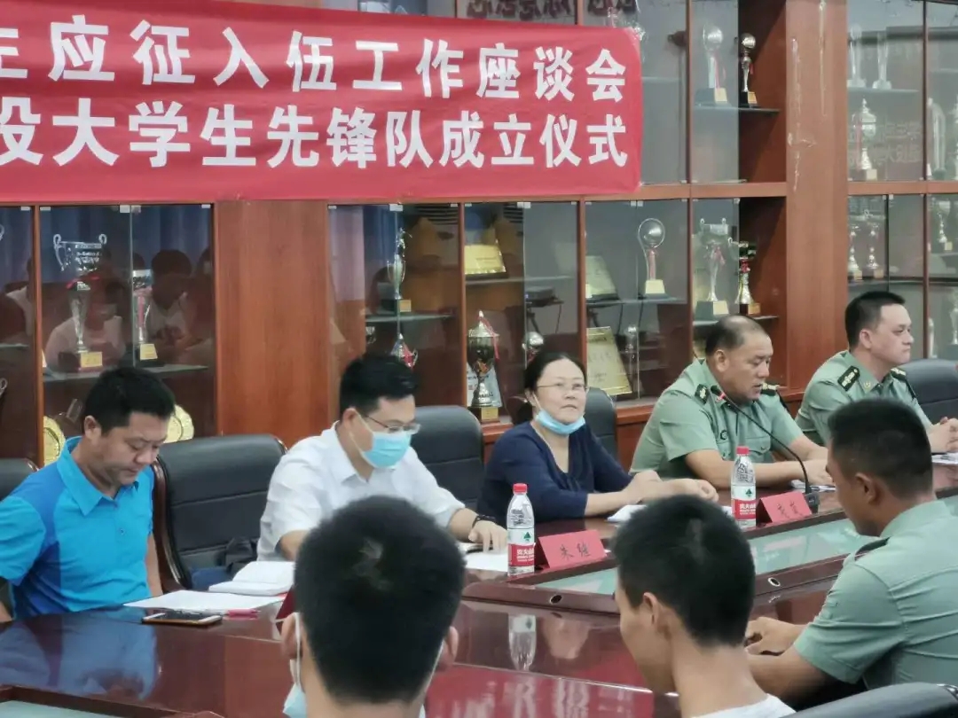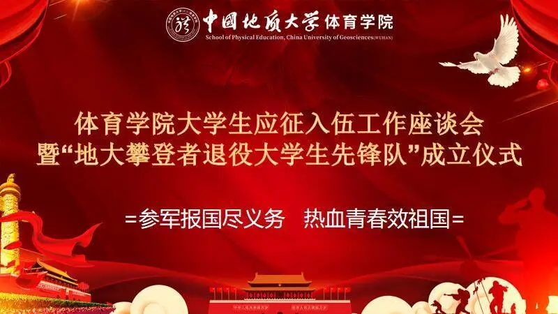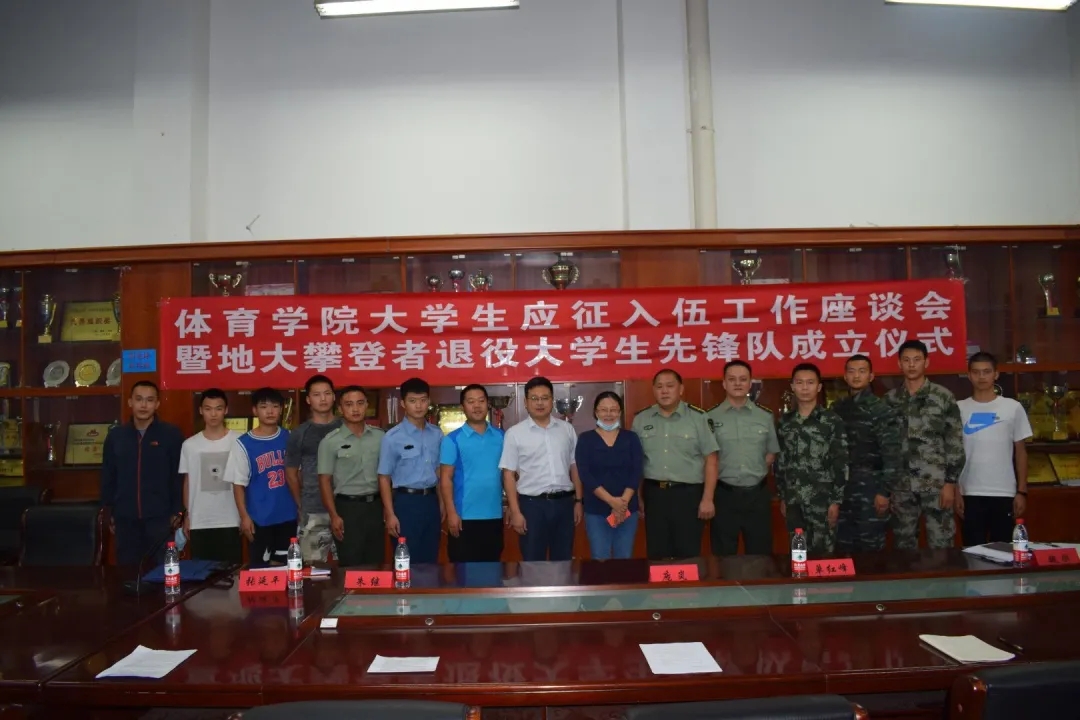 2020年9月10日15:00,beat365官网在体育馆二楼会议室召开了beat365在线唯一官网登录大学生参军应征工作座谈会暨地大攀登者退役大学生先锋队成立仪式。出席此次会议的领导有武装部副部长单红峰,学工部副部长朱继,武装部老师魏刚,beat365在线唯一官网登录党总支书记庞岚,beat365在线唯一官网登录党总支副书记张延平。参与本次会议的人员有beat365在线唯一官网登录在校的退役大学生和2020年应征入伍学生,以及beat365在线唯一官网登录部分同学。会议由131181班的陈岳峰同学主持。
