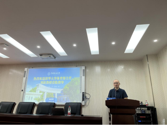 原校领导傅安洲教授致欢迎辞。他对清华大学体育部主任刘波教授来中国地质大学指导交流表示热烈欢迎,并深情回顾了清华大学与地质大学的深厚友谊,特别是建校初期,清华大学多位大家学者对学校人才培养的卓越贡献。他同时指出,清华大学与中国地质大学都有深厚的体育传统。地大的体育很有特色,清华大学的体育更是中国高校体育的标杆,祝愿两校在体育强国伟大事业中再创辉煌!