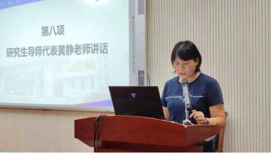 研究生导师代表黄静老师对研究生新生做出几点期望,一是明确目标定位,立志高远,贡献社会;二要提升能力,不断积累,刻苦学习研究是提高人力资本的重要途径;三要紧密团结同学,发现与学习他人优点,树立团队意识;四要加强导师沟通,探求学术无捷径,技能水平无近道,要有决心、恒心、耐心,有锲而不舍的学术追求和精神品质,要有强大的内心和直面压力的勇气和力量,去攀登学术殿堂的高峰。