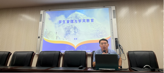院党委副书记朱军老师为全体本研新生讲解《学生管理与学风教育》,帮助新生了解大学学习的特点和基本要求,引导新同学们做好自我管理,确立合理的学业与职业目标,树立优良学风。