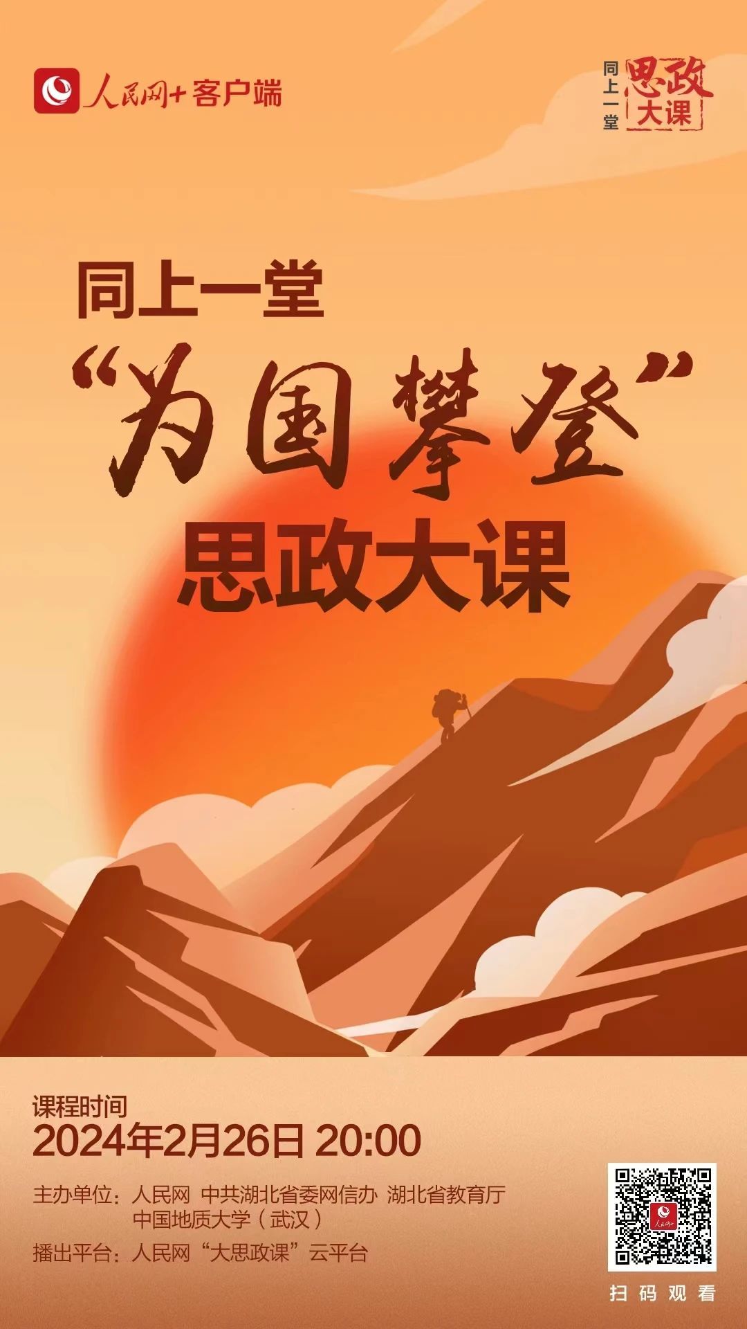 2月26日晚20:00,学院组织全院本研学生同上一堂“为国攀登”思政大课,听中国科学院院士中国地质大学(武汉)校长王焰新、地球科学学院教授宋海军、beat365在线唯一官网登录90后青年教师何鹏飞讲述征服珠峰的感人故事,领悟“扎根中国、胸怀天下勇攀高峰、追求卓越”的攀登精神。