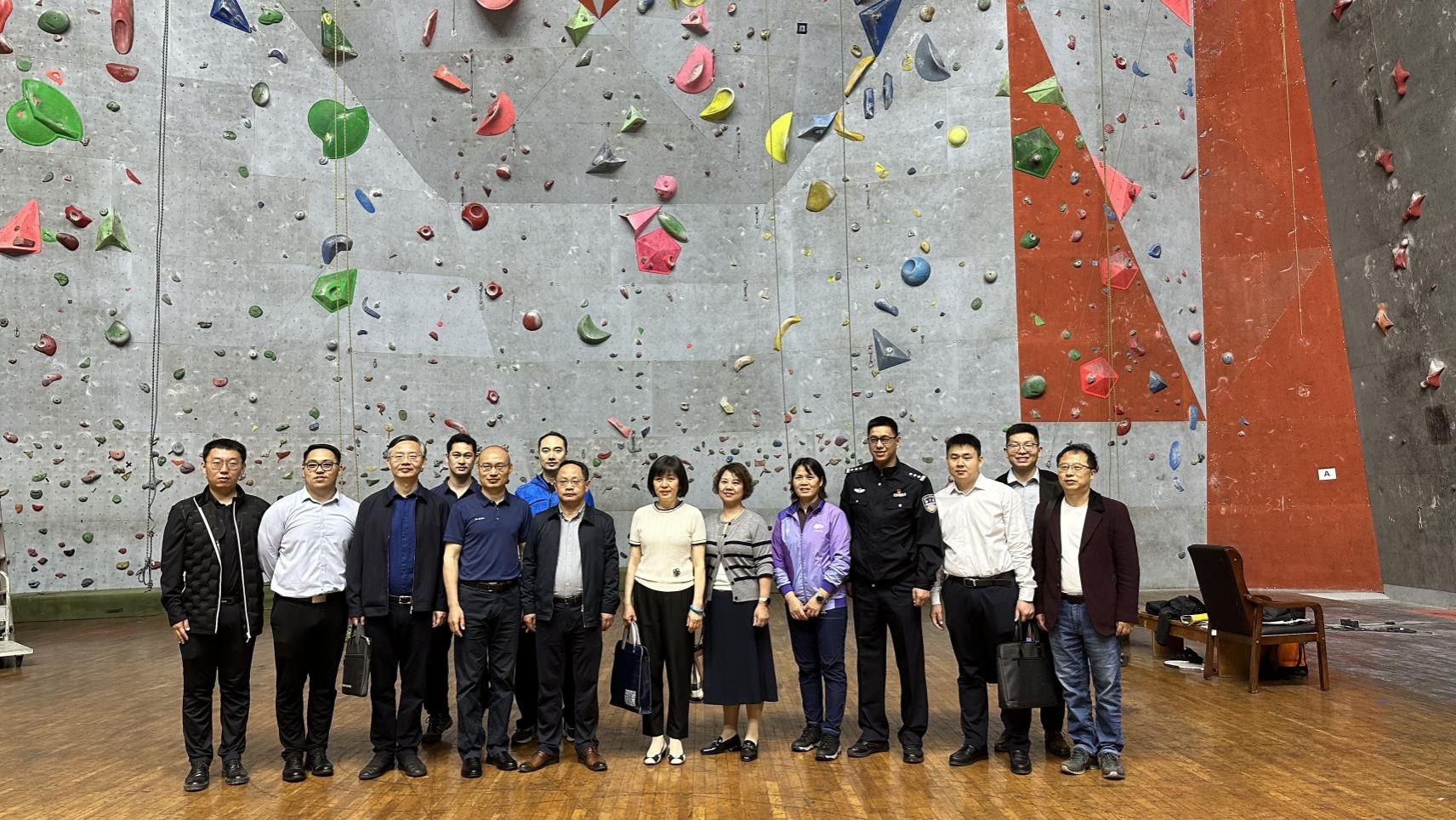 会前,李元院长陪同张再强主任一行参观荣誉墙和攀岩馆,详细介绍了学院的办学目标、学科特色等情况。