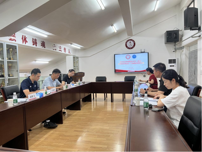 上午,在中国地质大学(北京)体育部开展调研交流学习。会上中国地质大学(北京)体育部主任马凯着重介绍了学校体育开展的基本情况,副主任张源介绍了学校体测工作的基本情况。在李伦副院长表明此次调研学习目的后,beat365在线唯一官网登录群体中心主任汪俊杰主任,体测办公室主任丁维维主任,高水平办公室主任褚鹏飞主任分别就群众体育、大学生体质健康测试、高水平队伍管理等内容开展深度交流。