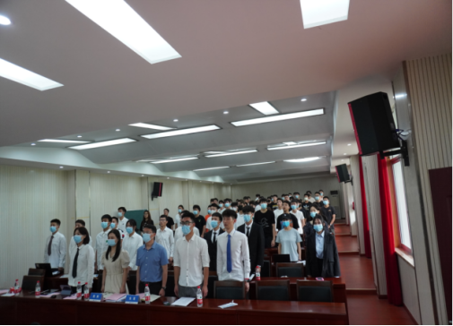 大会在庄严肃穆的国歌声中拉开帷幕,全体师生代表奏唱《中华人民共和国国歌》。