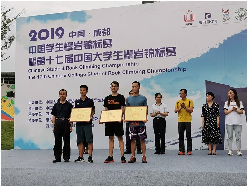 2019年中国学生攀岩锦标赛暨第十七届中国大学生攀岩锦标赛于7月24日至28日在四川旅游学院举行。beat365官网副校长、中国大学生体育协会攀岩分会副主席傅安洲教授应邀出席开幕式。beat365官网攀岩队选派出五名学生分别参加了甲组和丙组(高水平)比赛。同学们战高温斗酷暑、不畏强手、敢于拚搏,心理素质稳定,超水平发挥,共获得金牌3枚、银牌2枚、铜牌3枚,beat365官网获体育道德风尚奖。
